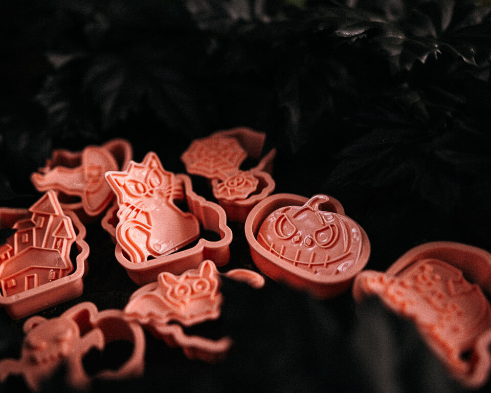 Form & Präzision: Die Stempel prägen das Motiv direkt in den Teig – perfekte kleine Kürbisse, Geister & Co.